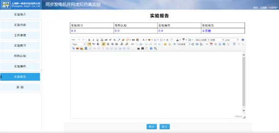 本项目由实验简介、实验内容、工作原理、实验预习(理论题)、结构认知、实验操作(仿真实验)、实验报告组成,学生完成实验、编写并生成实验报告后提交电子版,老师可查看学生操作的步骤,并给出评分和评价。