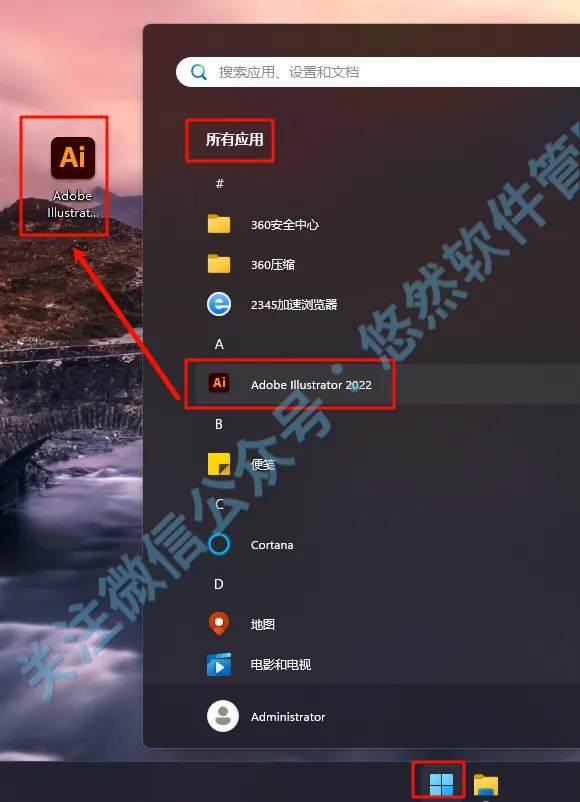 6.点击【开始】菜单,点击【所有应用】在里面找到【Adobe Illustrator 2022】图程序,将图标拖移至桌面