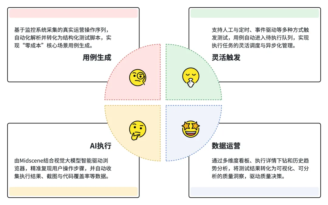 通过这四个阶段的闭环,系统实现了从真实运营行为到自动化测试用例的完整转化,并将执行结果转化为可运营的质量数据。