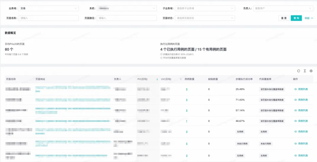 展示内容:按业务域 / 系统 / 负责人筛选、页面级 PV/UV、用例数量、步骤执行成功率、代码覆盖率等指标。系统能力:页面维度汇总视图,将访问热度(PV/UV)与自动化质量指标(成功率 / 覆盖率)结合,指导用例优先级(高 PV 页面优先铺用例、优先治理)。