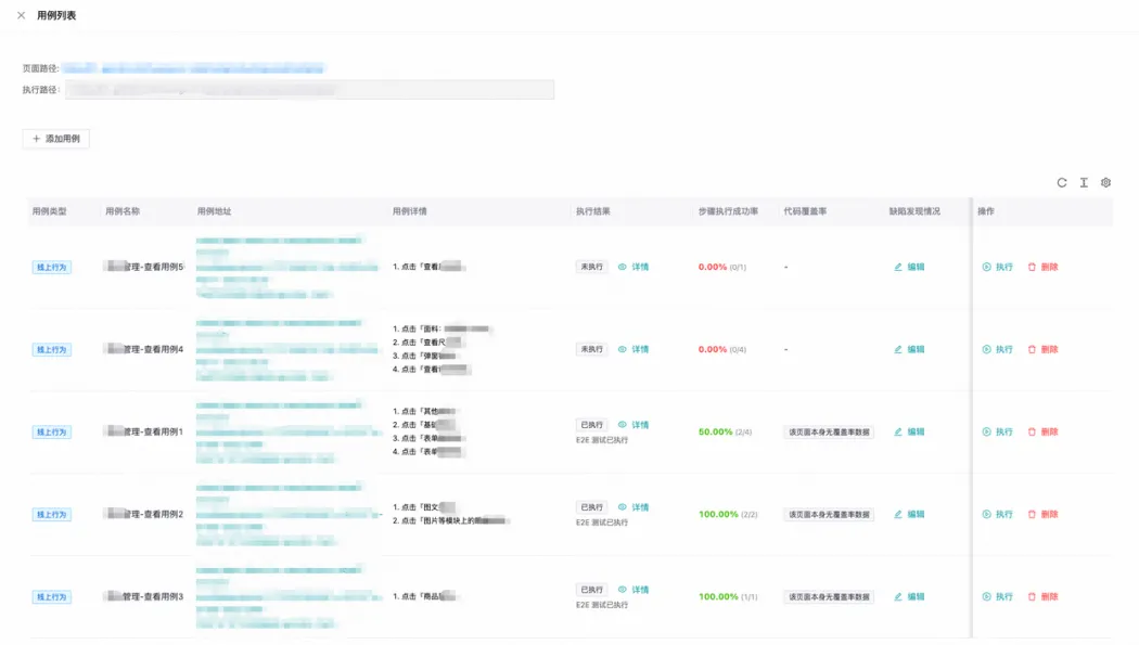 展示内容:每条用例绑定监控系统信息、点击行为数量、执行结果、步骤成功率、打标及备注、执行/删除操作。系统能力:以线上运营行为列表为用例数据,将 可执行性评估/识别执行结果与预期偏差/可信度(打标)统一实现。