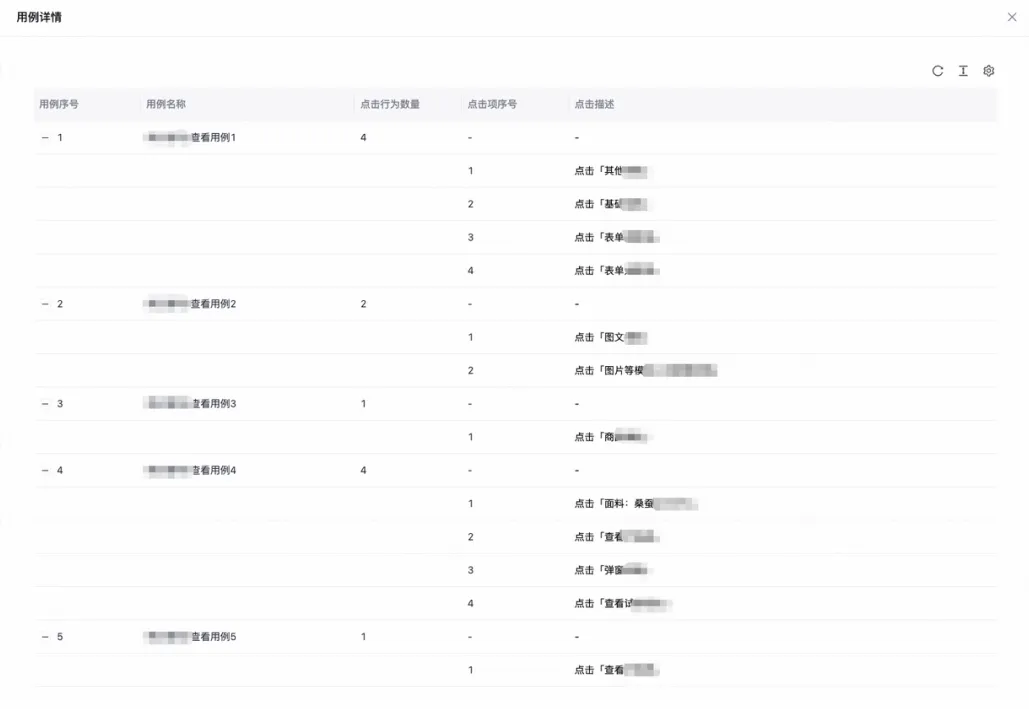 展示内容:点击序号、点击描述(如点击某某预览弹窗/眼睛按钮)、点击行为数量等。系统能力:系统会为 Click Scope 生成更可读的描述,便于非开发同学理解与复盘,也是后续策略库/稳定性治理的输入。