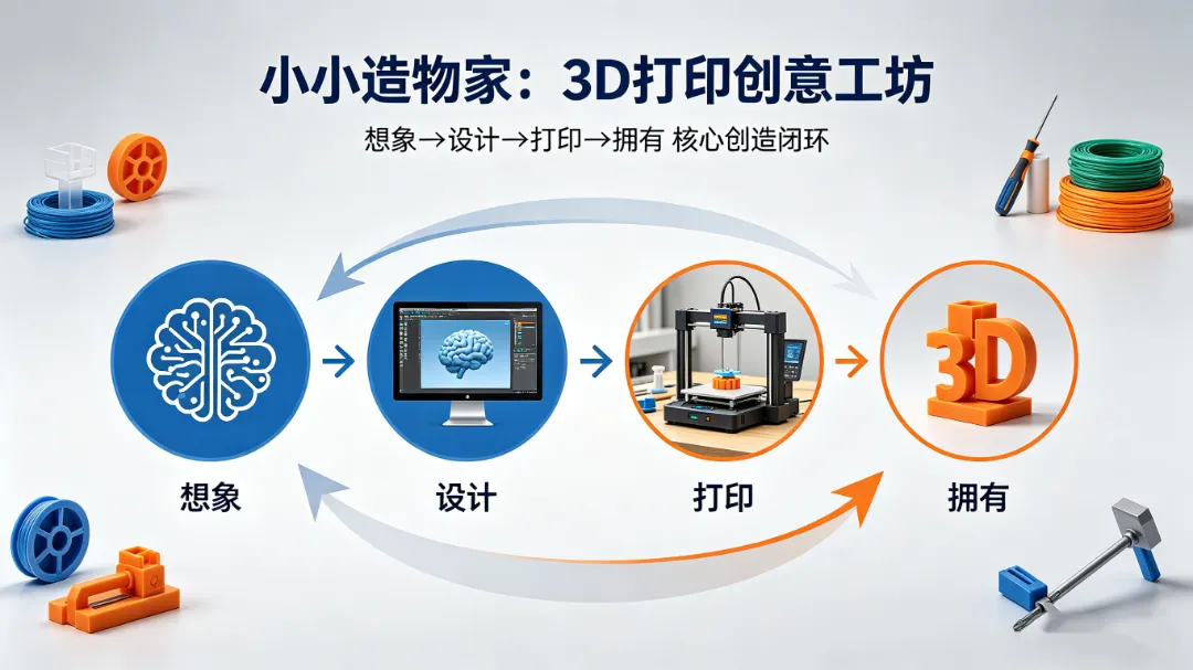 欢迎来到 “小小造物家:3D打印创意工坊” ——一场专为8-12岁孩子设计的、从“想法”到“实物”的完整创造之旅。