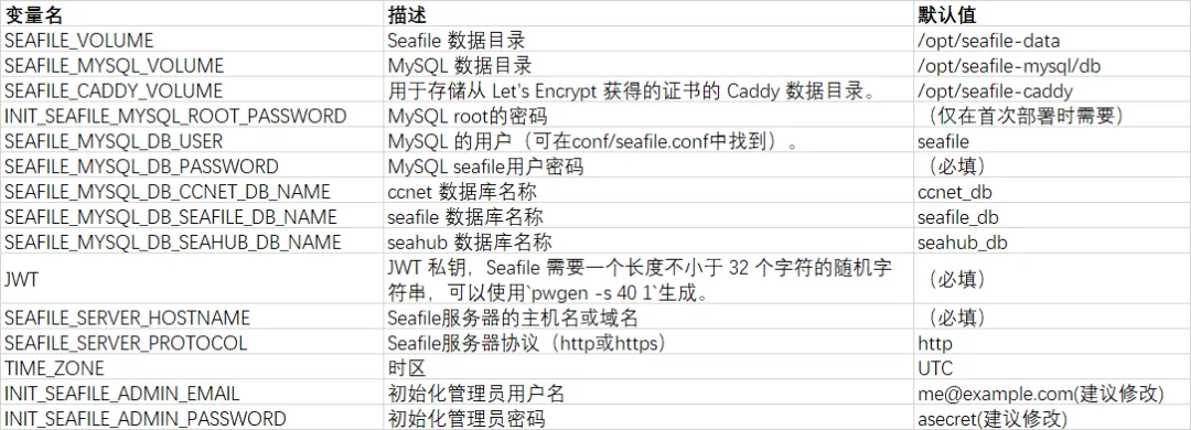 mkdir /opt/seafilecd /opt/seafile# Seafile CE 13.0wget -O .env https://manual.seafile.com/13.0/repo/docker/ce/envwget https://manual.seafile.com/13.0/repo/docker/ce/seafile-server.ymlwget https://manual.seafile.com/13.0/repo/docker/seadoc.ymlwget https://manual.seafile.com/13.0/repo/docker/caddy.ymlnano .env