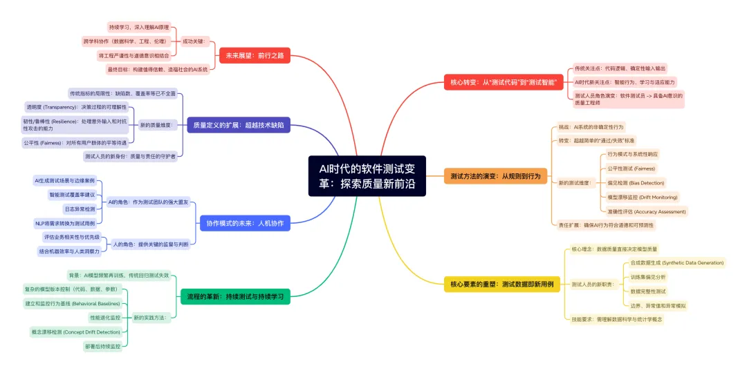 这篇文章的核心观点是,人工智能(AI)的崛起正在从根本上改变软件测试的性质,使其从传统的“测试代码”演变为更复杂的“测试智能”。这一转变要求测试人员(现在是具备AI意识的质量工程师)掌握新技能,并采用全新的方法论和思维模式。