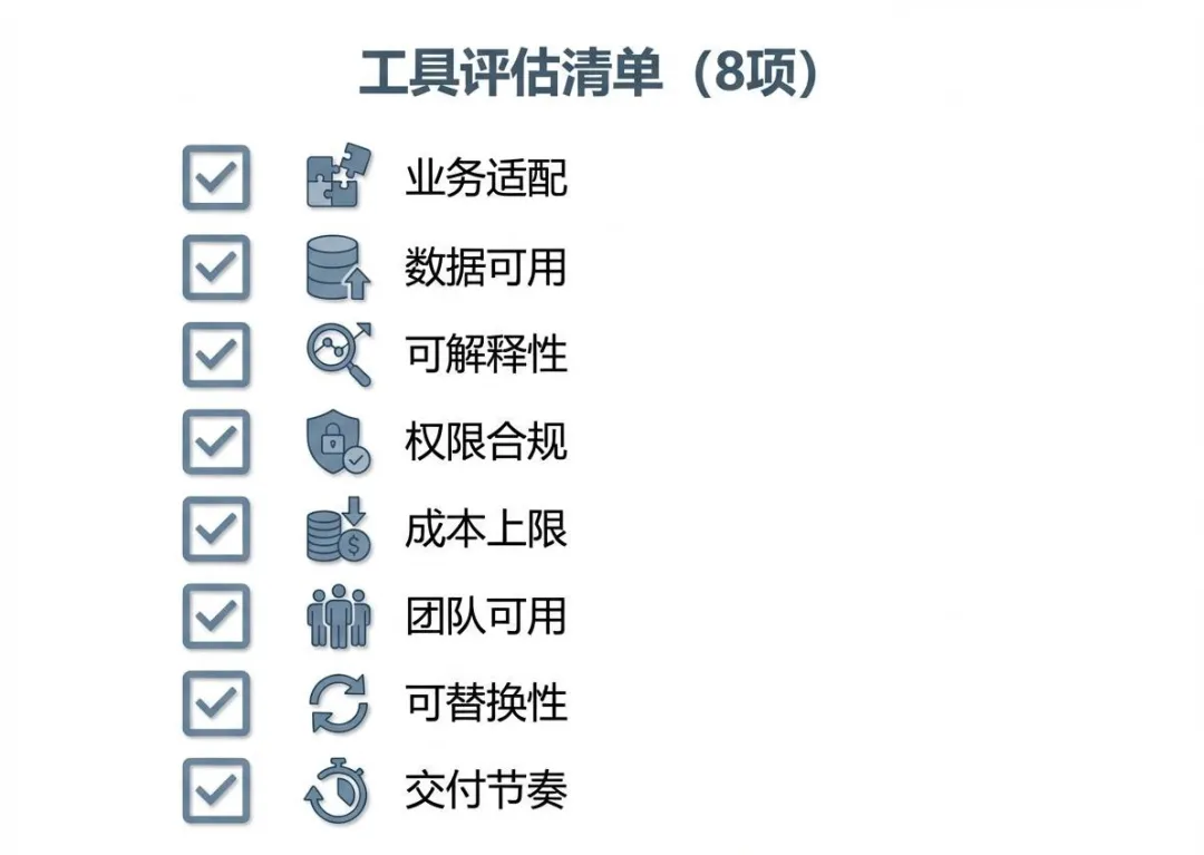 •数据可用:你手里有没有稳定、干净、可持续更新的输入?没有就别急着上。