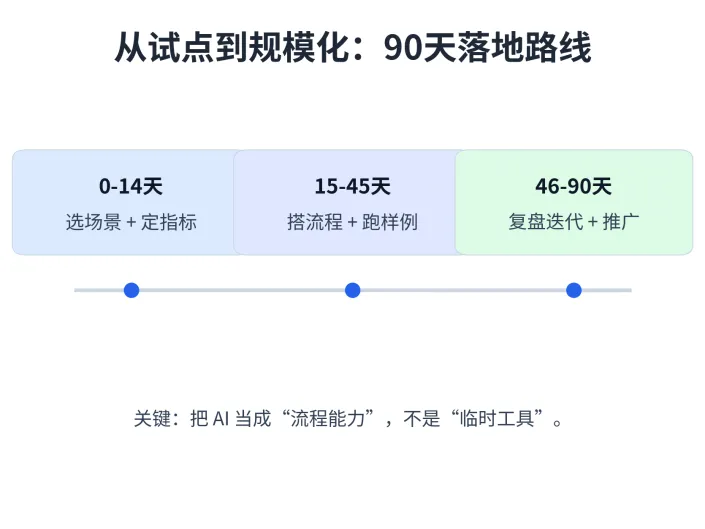 2)定一个能被团队认可的指标:节省时长/返工率/转人工率/投诉率/素材迭代速度。