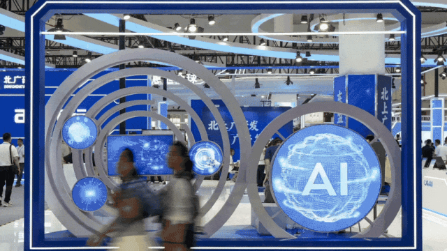 2026年4月14日,人们走过第六届消博会主会场海南国际会展中心一处AI主题布景。新华社记者 辛悦卫 摄 动态图片由AI辅助生成