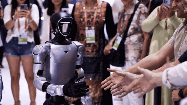 2026年4月14日,在第六届消博会科技消费展区,观众与宇树机器人互动。新华社记者 高静 摄 动态图片由AI辅助生成