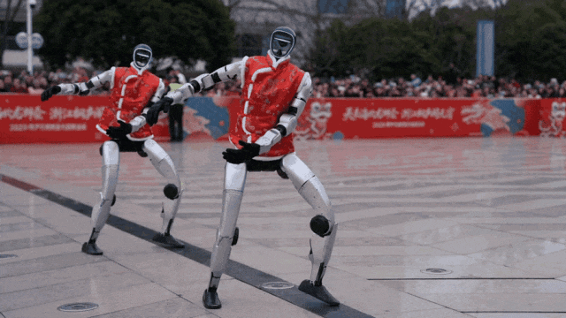 2026年2月28日,宇树科技人形机器人在浙江省桐庐县中心广场表演舞蹈。新华社记者 黄宗治 摄 动态图片由AI辅助生成