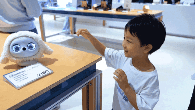 2025年12月21日,在位于深圳的全球创新旗舰店inno100,一名儿童与AI玩具Ropet互动。新华社记者 毛思倩 摄 动态图片由AI辅助生成