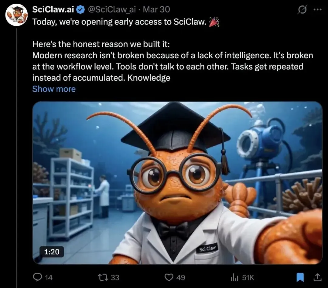 近日,科研圈被一只“龙虾”(SciClaw)彻底点燃!一款名为 SciClaw(官网:https://sciclaw.ai)的科研专属智能体产品一经发布,瞬间引爆国内外科研圈。