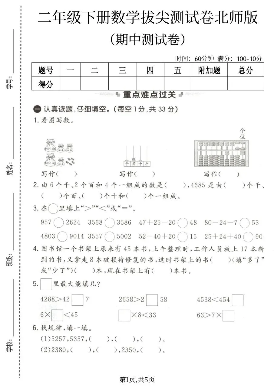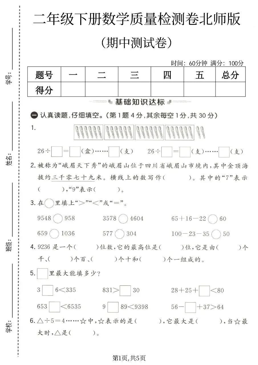 2026年二年级下册北师版数学《期中测试卷》4套,电子版可打印可下载。这份二下北师版数学期中重点多套测试卷,包含二下数学期中拔尖测试卷、二下数学期中达标卷、二下数学名校真题卷等,共4套,帮助孩子检测知识,查漏补缺,备考期中考试。需要的家长给孩子打印出来吧。