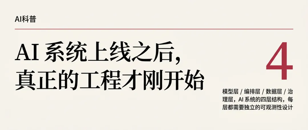 模型层 / 编排层 / 数据层 / 治理层,AI 系统的四层结构,每层都需要独立的可观测性设计