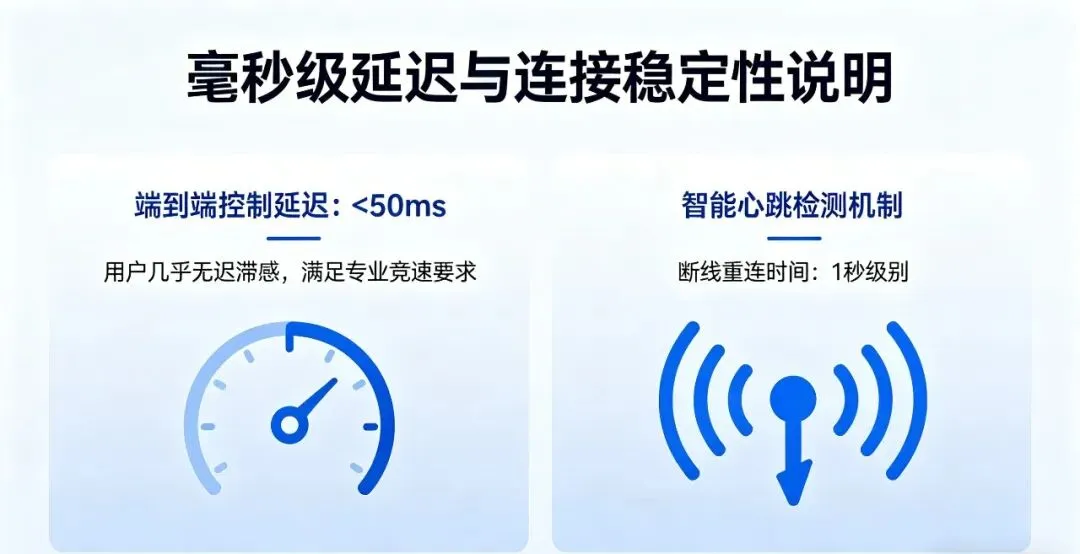 毫秒级延迟: 成功将端到端的控制延迟控制在 50ms 以内,用户几乎感知不到远程操控的迟滞感,达到了专业级竞速要求。