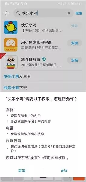 快乐小鸡在安装时索取位置权限。