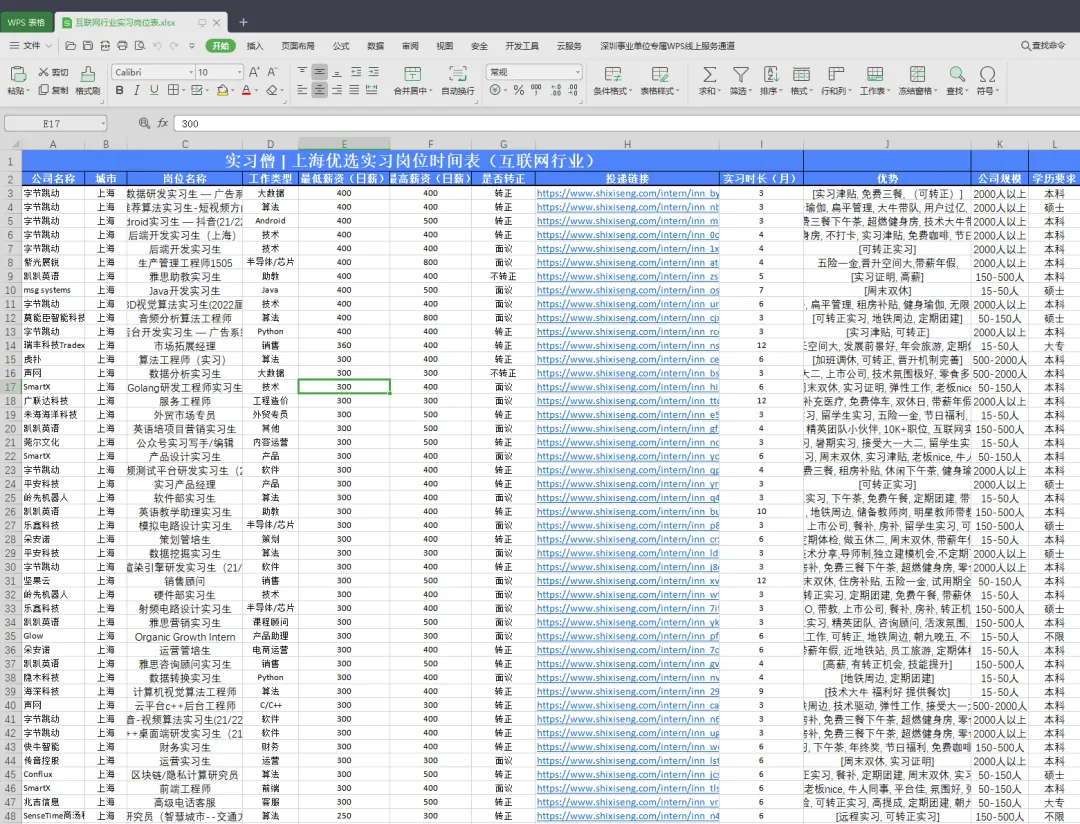 上传的Excel数据包括公司名称、城市、岗位名称、工作类型、最低薪资(日薪)、最高薪资(日薪)、是否转正、 投递链接、实习时长(月) 、优势 、公司规模、学历要求。