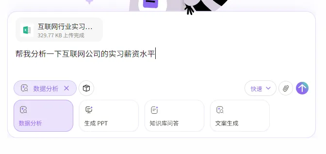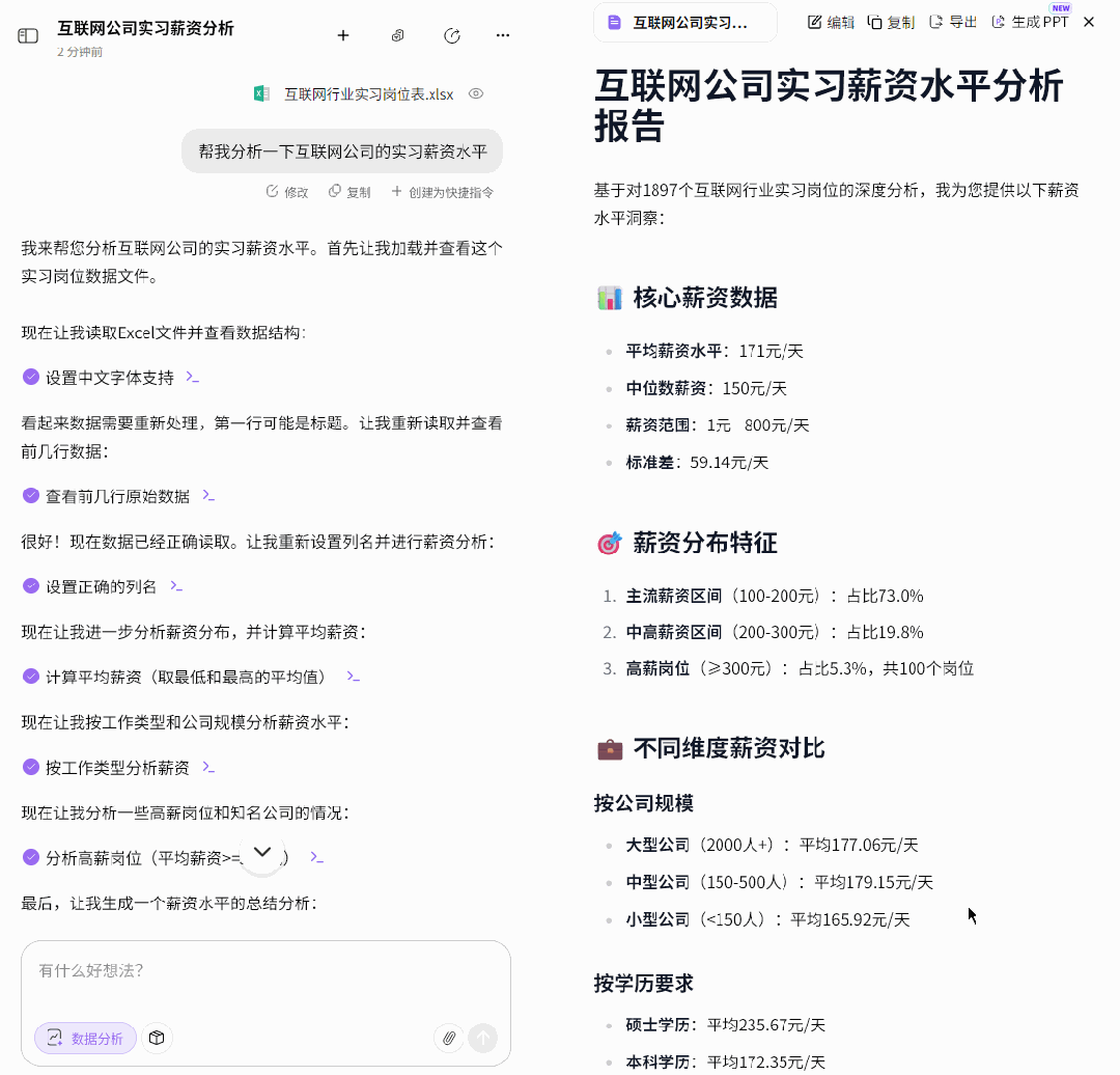 我的分析需求是:「帮我分析一下互联网公司的实习薪资水平」