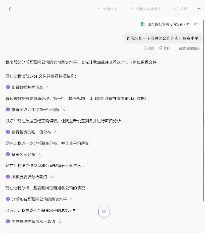 「办公小浣熊」可以实现快速地读取、清洗、分析着我提供的数据。你可以看到它的整个思考和操作的过程,这个交互方式非常有趣。