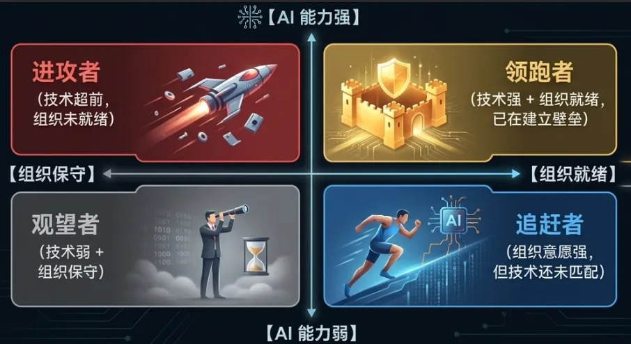 Gartner 数据显示,当前大多数企业处于”观望者”区间——知道 AI 重要,但既没有投入技术能力,也没有启动组织变革。