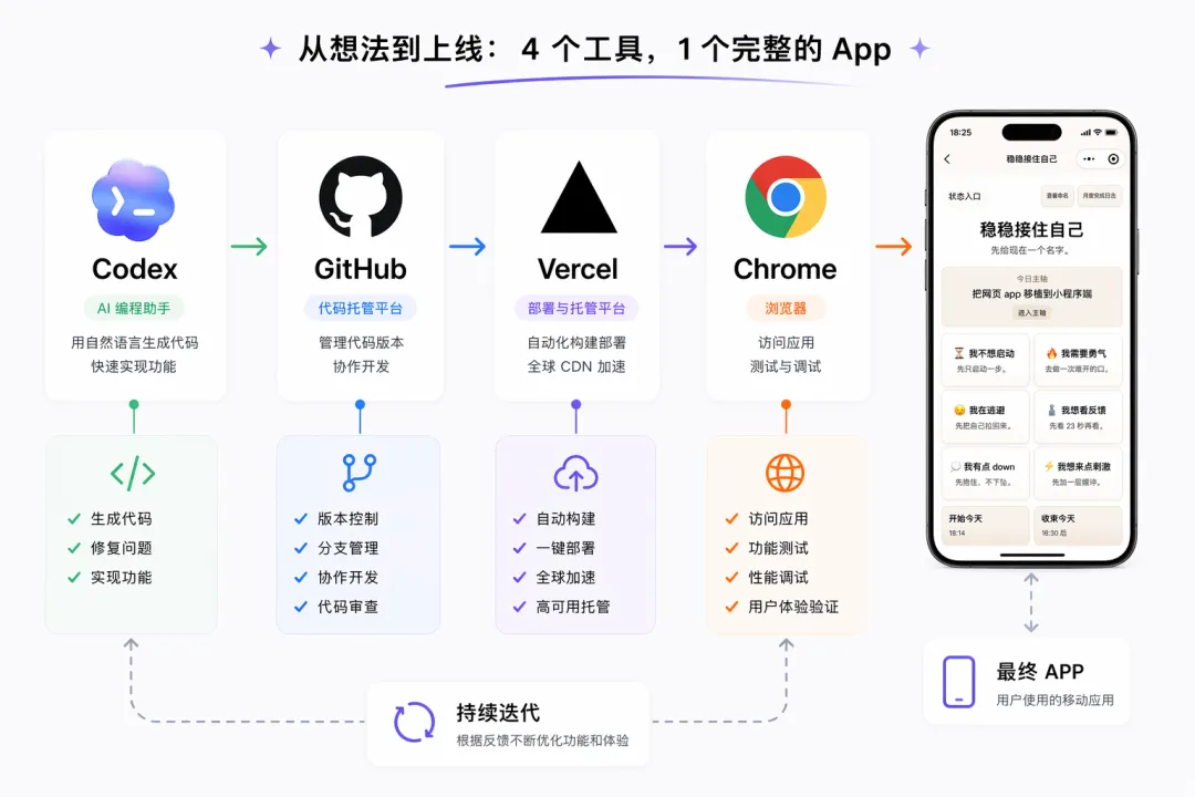 所以,快速做一个别人能试的 app,你其实只需要 Codex、Github、Vercel 还有一个手机上的 Chrome 浏览器。Chrome 浏览器有个功能,可以把当前页面添加到手机主屏幕,然后就能当 app 跑了。
