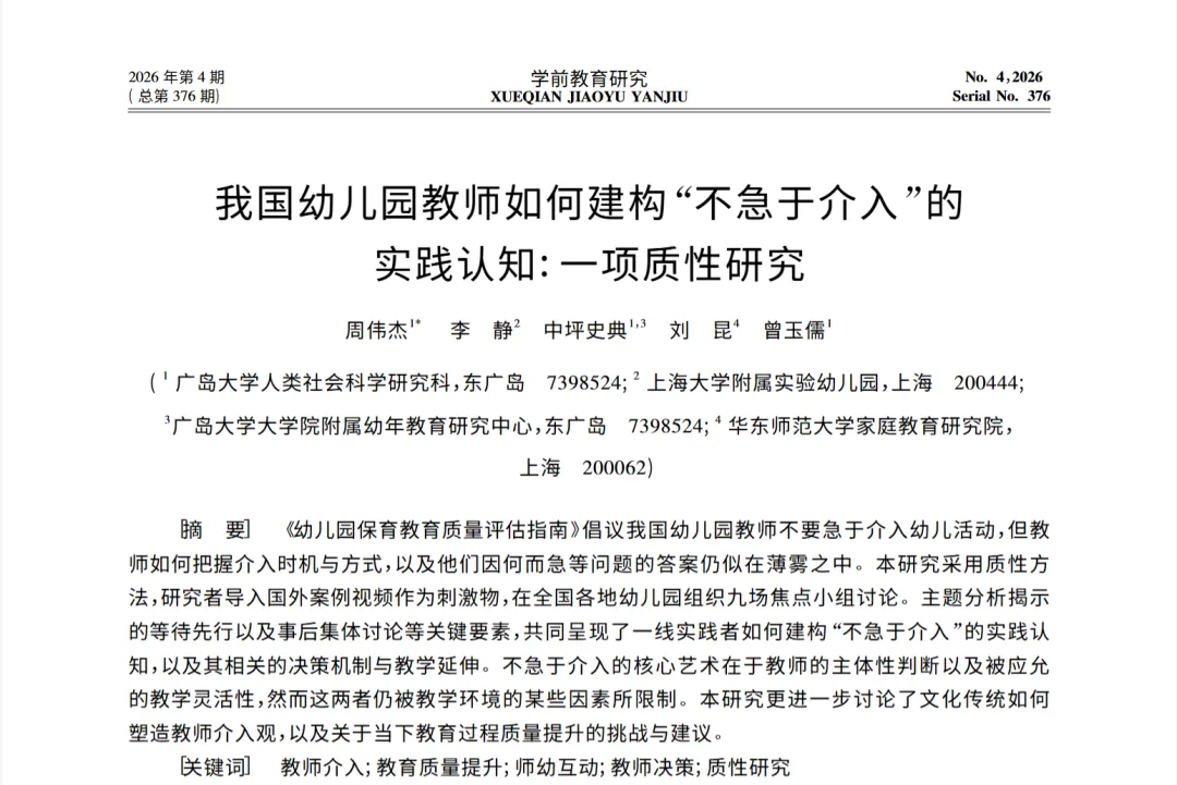 周伟杰, 李静, 中坪史典, 刘昆, 曾玉儒. 我国幼儿园教师如何建构“不急于介入”的实践认知:一项质性研究[J]. 学前教育研究, 2026, (04): 12-26.