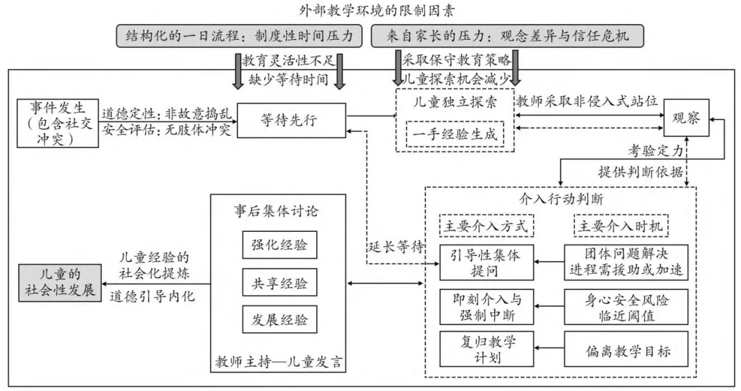 1.遵循 “等待 – 观察 – 介入 – 讨论” 递进实践路径,等待创造经验空间,观察提供介入依据,介入权衡安全、进程、计划三大要素,集体讨论实现经验社会化重构。