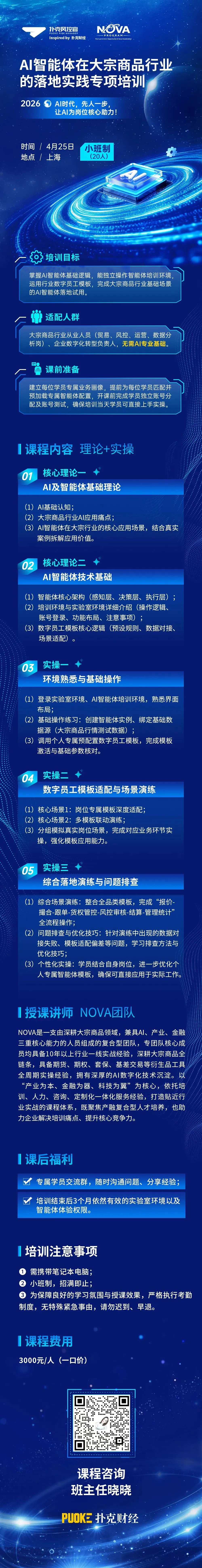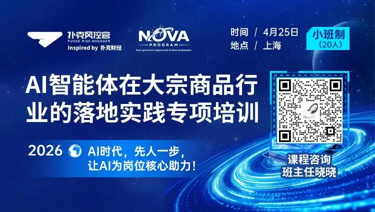现在,扑克财经旗下扑克风控官和NOVA联合重磅推出「AI智能体在大宗商品行业的落地实践专项培训」,专为大宗商品人量身打造,无需AI基础,1天吃透实操,3个月持续赋能,帮你快速打破能力壁垒,摆脱低效内耗!