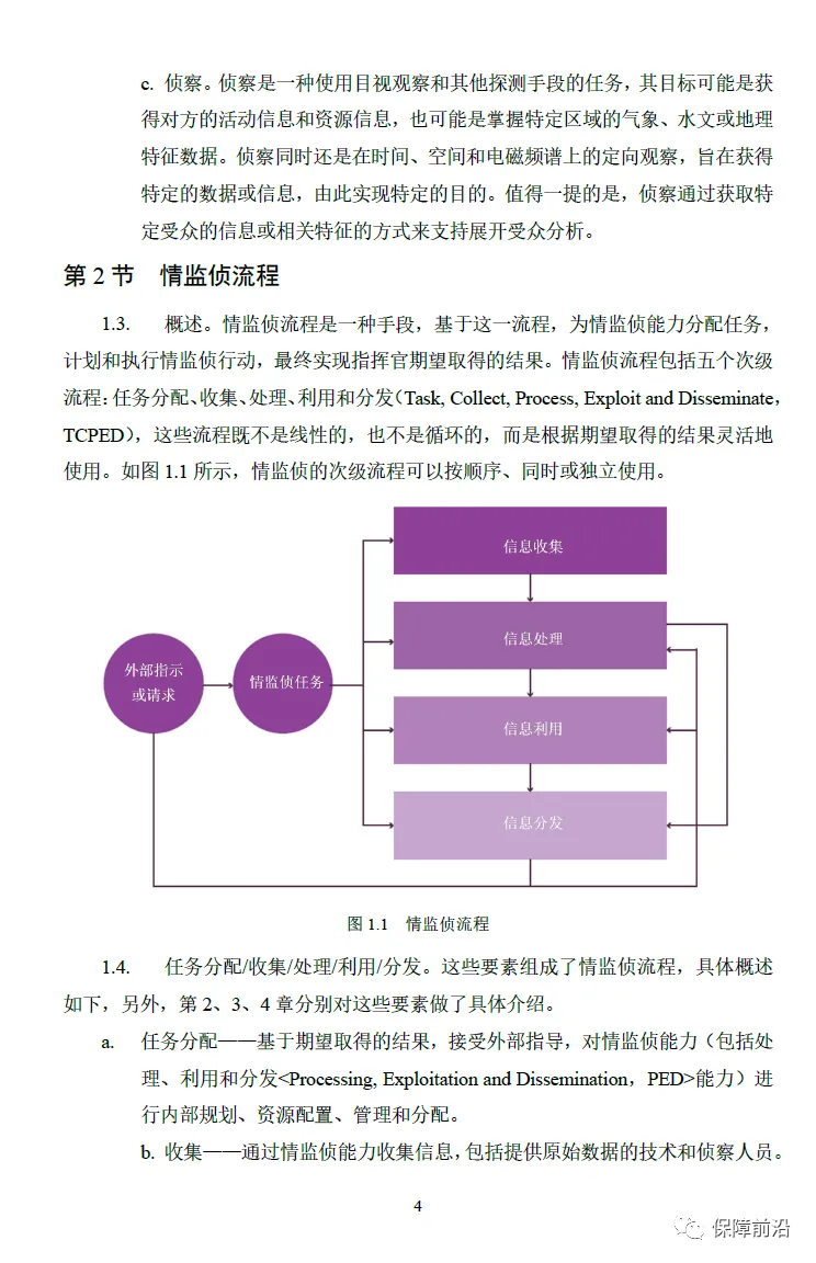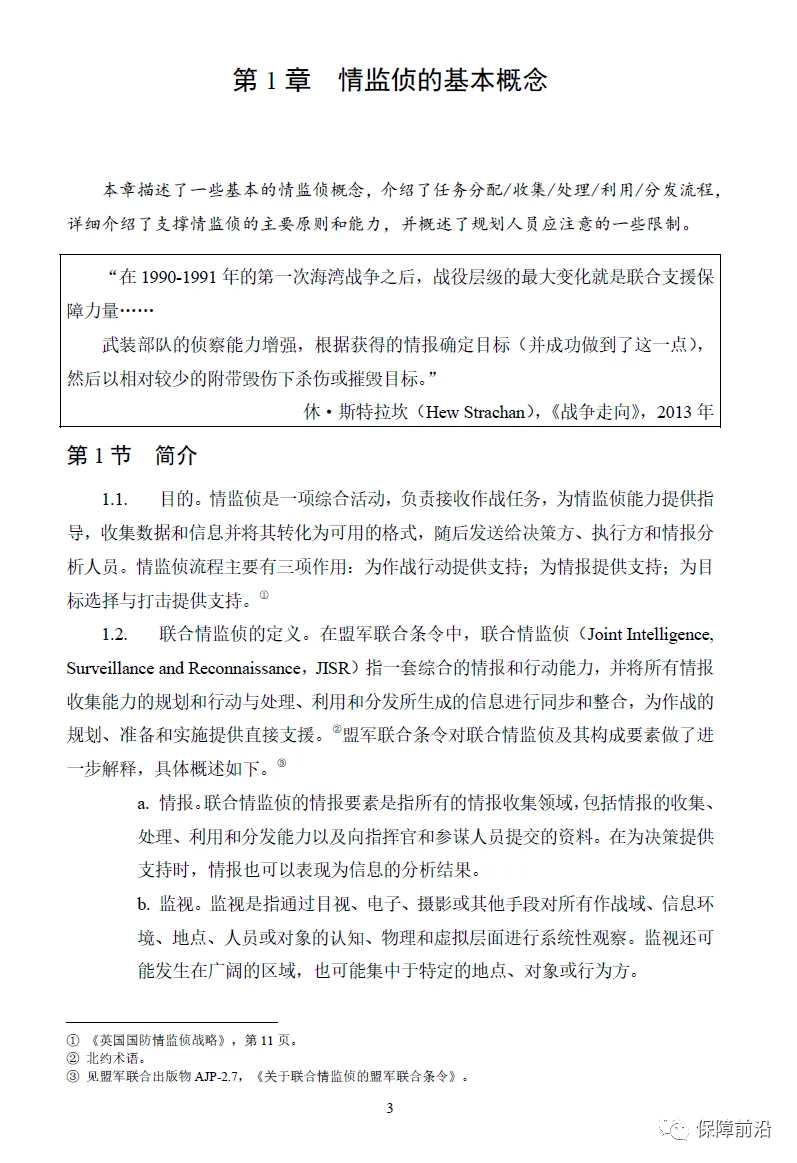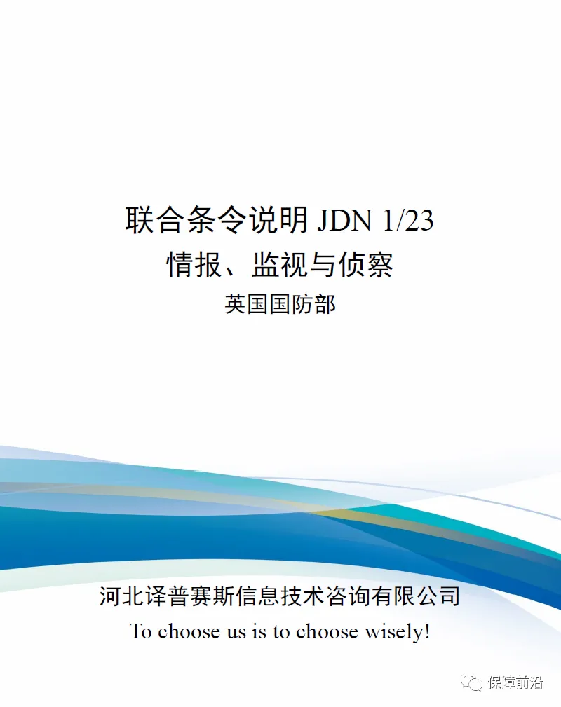 盟军联合出版物AJP-2.7《盟军联合情报、监视与侦察条令》,详细介绍了北约联合情报、监视与侦察流程。英国继续发布国家情报、监视与侦察条令的决定,表明在《英国国防情报、监视与侦察战略》发布后,各方希望英国提供更多关于情报、监视与侦察方案的重要细节。英国联合条令说明JDN 1/23《情报、监视与侦察》尝试提供情监侦领域当前和未来的概念,并将现有条令和最佳实践结合起来。本篇联合条令说明具有探索性意义,包括一些尚未达成一致的原则和概念。本书第1章介绍了几个基本的情监侦概念,包括任务分配、收集、处理、利用和分发;第2章描述了任务分配的核心要素,详细介绍了任务分配的关键作用;第3章介绍了任务分配/收集/处理/利用/分发流程中的信息收集工作,包括信息收集的特点和方法,同时还介绍了信息收集活动的规划和实施;第4章描述了信息的处理、利用和分发以及具体的实施流程;第5章介绍了基于活动情报的以问题为中心的情监侦,《英国国防情监侦战略》将此种方法确定为未来执行情监侦任务的首选方法。本章还研究了自动化、人工智能和机器学习;第6章介绍了更广泛作战规划中的情监侦实施流程。