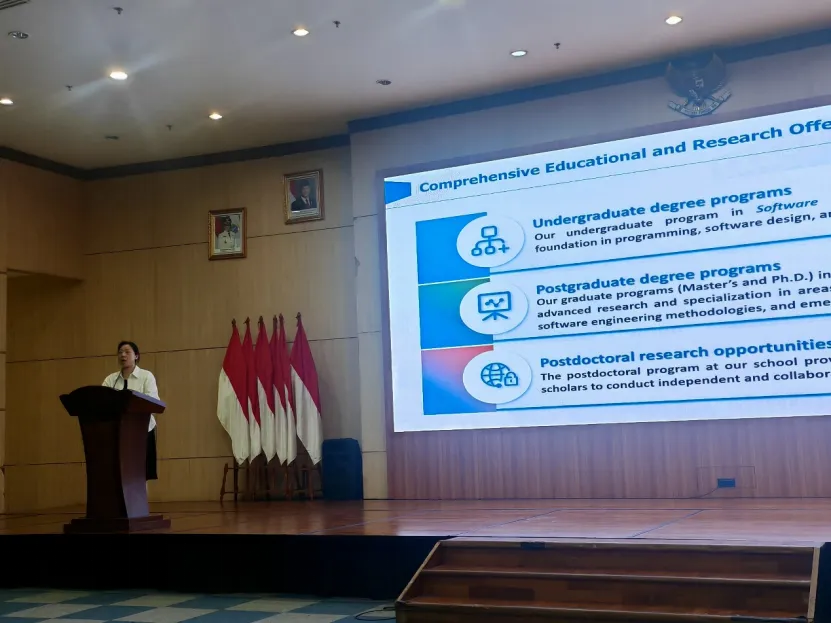 4月13日上午,代表团赴Dwiwarna高中开展招生宣传。该校为印尼顶尖寄宿制中学,获印尼国家认证机构(BAN-S/M)授予的A级(优秀)评级。在介绍我校国际学生招生整体情况后,各学院围绕奖学金项目、英文授课项目及短期项目进行专题推介。武剑洁老师重点介绍了学院面向国际学生的英文授课硕士项目及奖学金申请渠道,强调学院注重产学研结合,与多家知名科技企业建立了实习基地,为国际学生提供丰富的实践机会。
