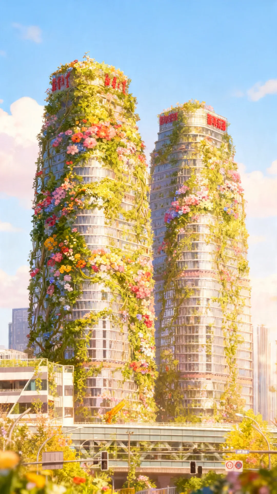 繁花从玻璃幕墙间生长