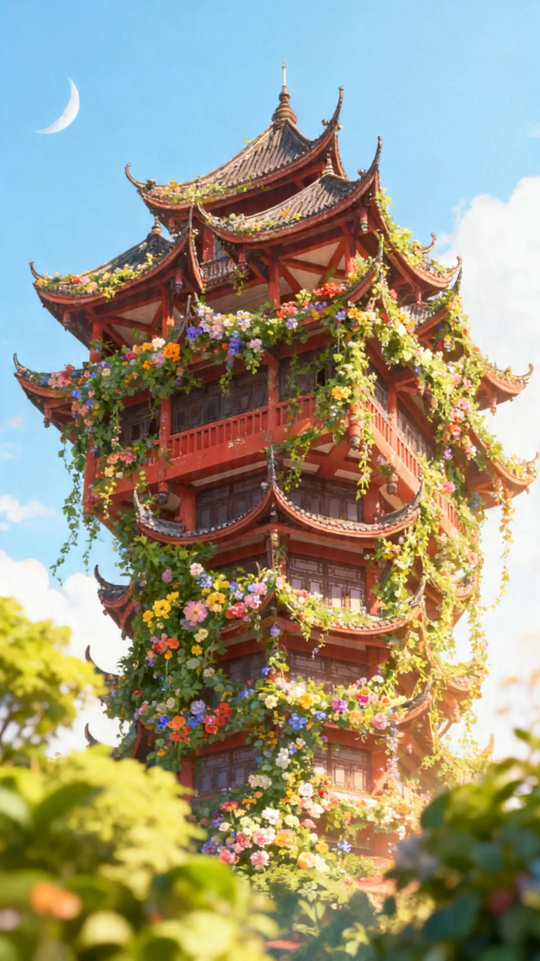 花朵缠绕朱红梁柱
