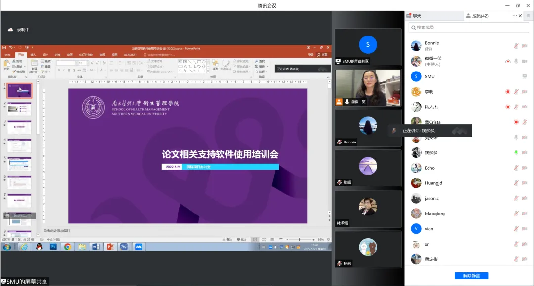 5月21日,卫生管理学院国际项目办举办了首期中葡合作博士项目论文相关软件使用线上培训会,学院副院长钱怡、国际项目办公室相关人员及五十余名来自各年级学员参加了本次培训。