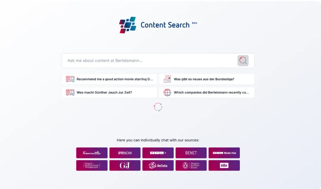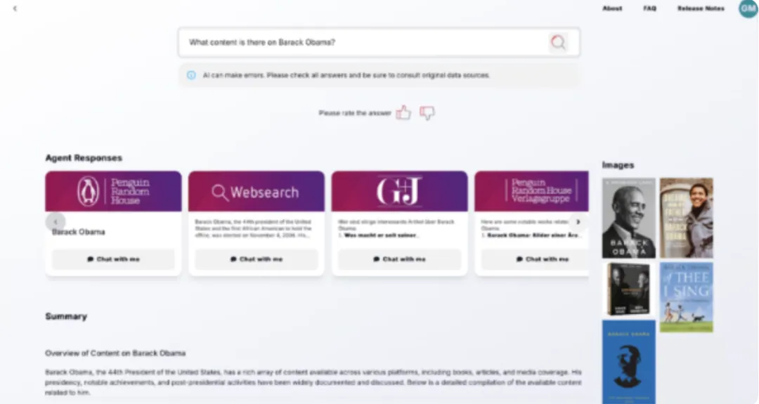 贝塔斯曼内容搜索采用了一种截然不同的方法。鉴于贝塔斯曼庞大的业务组合,将所有数据集中到一个系统中是一项艰巨的任务,而团队并没有这样做,而是构建了一个多智能体系统,用于协调跨现有平台和数据源的搜索。