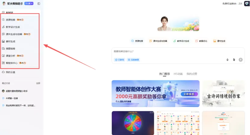 1.AI 智能助手、教学设计自动生成、课件素材一键制作;