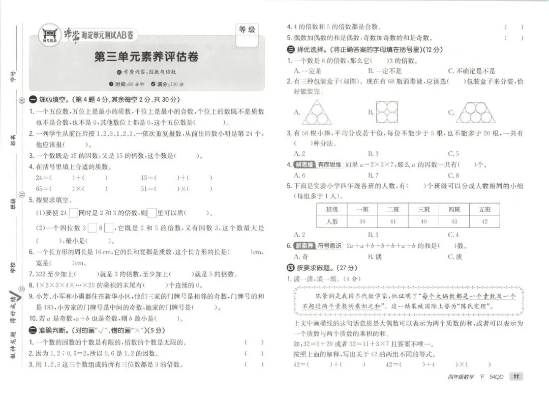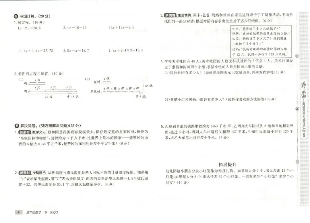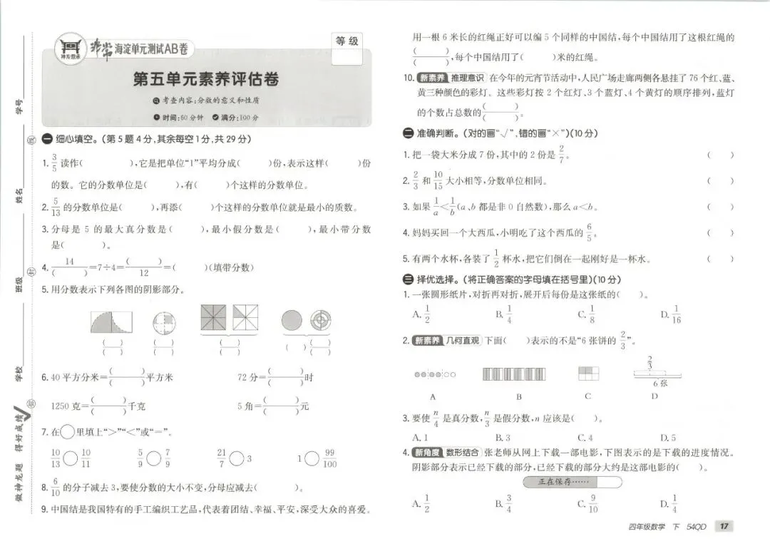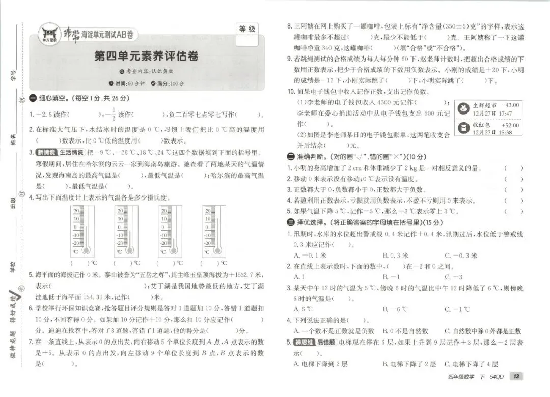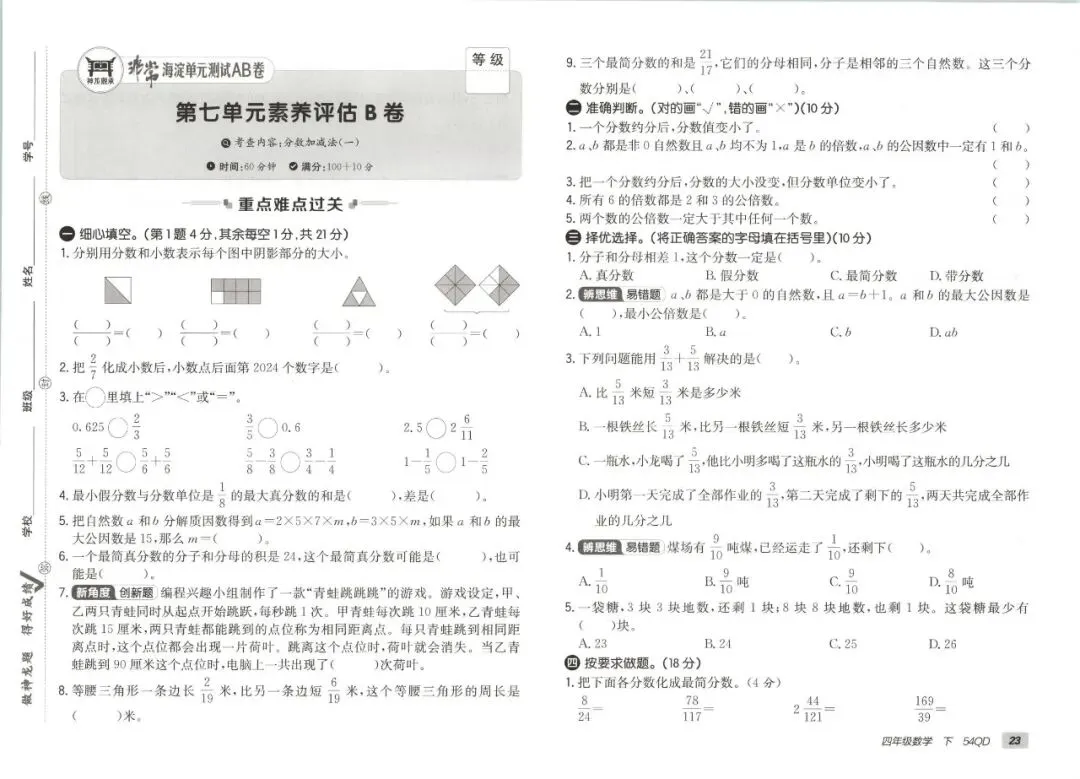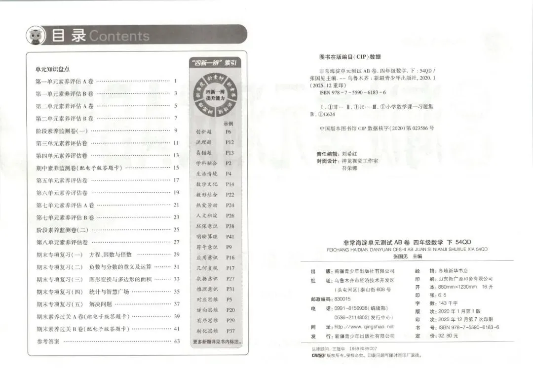 26年春新版四年级数学青岛54版《单元知识盘点+素养评估卷+期末专项复习+素养过关卷》,可打印下载(含答案)
