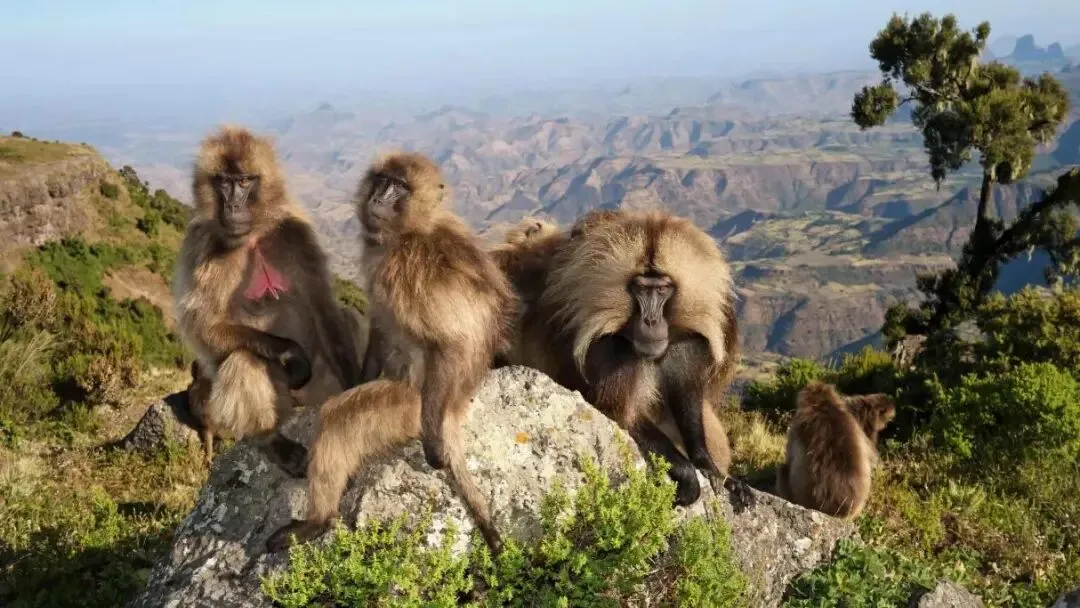 栖息在这片高地上的猴子是狮尾狒(geladas),也被称为“狮猴”。它们体型庞大、极具魅力,拥有浓密的浅色长毛和异常发达的犬齿。而人类则以务农为生,依靠小麦种植和养羊维持生活。长期以来,狮尾狒的生存处于劣势,它们不断被猎杀并被迫退往更高的山地。但自从西米恩山国家公园(Simien Mountains National Park)建立以来,它们得到了保护,旅游业的兴起也在一定程度上提升了它们的“存在价值”。