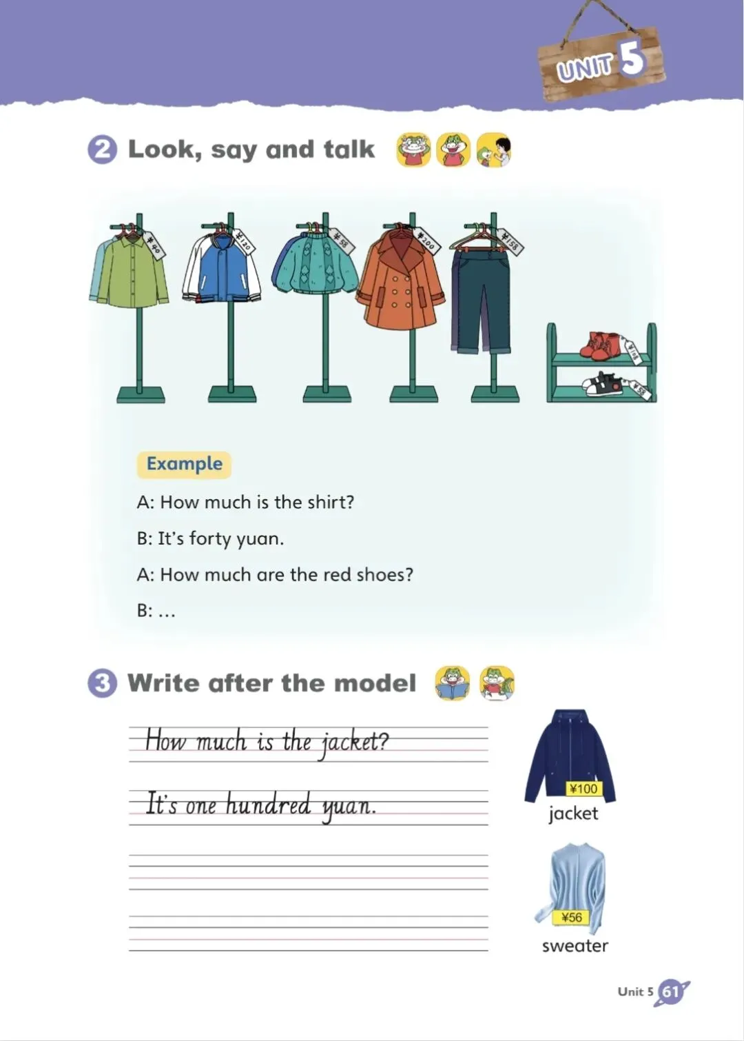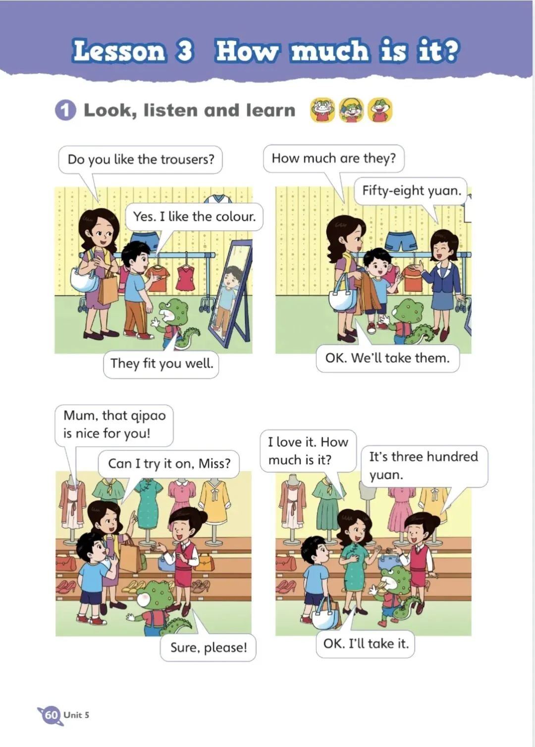 课文翻译Lesson 3 How much is it? 第三课 它多少钱?①Look, listen and learn 看一看,听一听,学一学Do you like the trousers? 你喜欢这条裤子吗?Yes. I like the colour. 是的。我喜欢这个颜色。They fit you well. 它们很适合你。How much are they? 它们多少钱?Fifty-eight yuan. 五十八元。OK. We’ll take them. 好的。我们买了。Mum, that qipao is nice for you! 妈妈,那件旗袍很适合你!Can I try it on, Miss? 小姐,我能试穿一下吗?Sure, please! 当然可以,请!I love it. How much is it? 我喜欢它。它多少钱?It’s three hundred yuan. 三百元。OK. I’ll take it. 好的。我买了。②Look, say and talk 看一看,说一说,聊一聊Example 范例A: How much is the shirt? A:这件衬衫多少钱?B: It’s forty yuan. B:四十元。A: How much are the red shoes? A:这双红色的鞋子多少钱?B:… B:……③Write after the model 仿照示例写一写How much is the jacket? 这件夹克多少钱?It’s one hundred yuan. 它一百元。