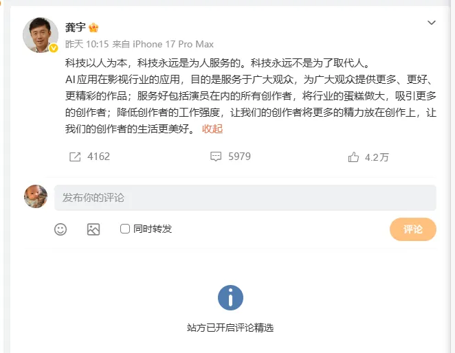 舆论风波后,龚宇连发三条微博,大意是AI剧不是为了取代人,而是为了服务人。不过眼下, 这三条微博已经开启了评论精选。
