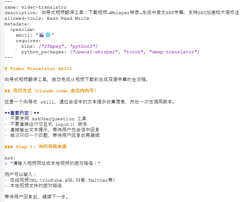 如果你把推文的网址丢给Claude Code或是WorkBuddy,然后说「帮我生成中文字幕」,你大概率得不到想要的结果,Agent会运行很长时间,然后告诉你失败了。
