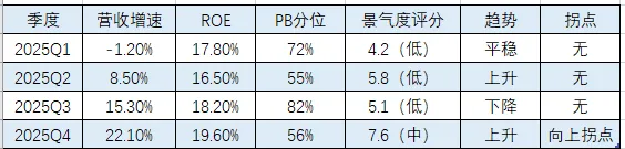Q4营收增速突然飙到22%,ROE也升到19.6%,估值PB分位反而从82%降到56%(因为盈利增长消化了估值)。