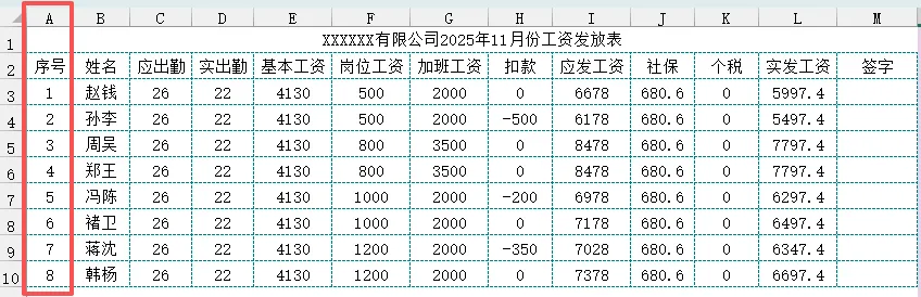 查找数组:工资发放!$A:$A,绝对引用,同样是为了向右填充时保持列不变;