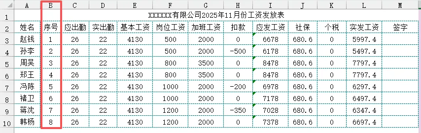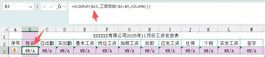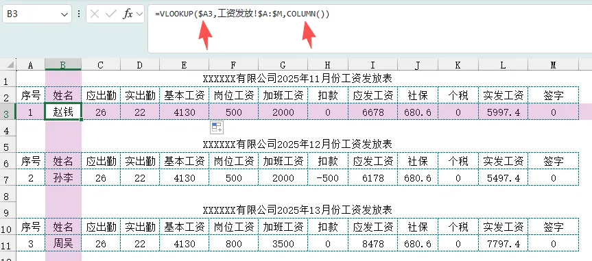 返回数组:工资发放!B:B,相对引用,向右填充时随着列的变动返回相应的数据。
