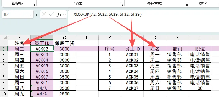 通过A列的姓名查找员工ID,B2单元格公式:=XLOOKUP($A2,$G$2:$G$9,$F$2:$F$9)