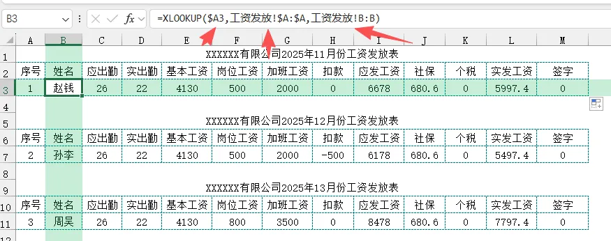 =XLOOKUP($A3,工资发放!$A:$A,工资发放!B:B)