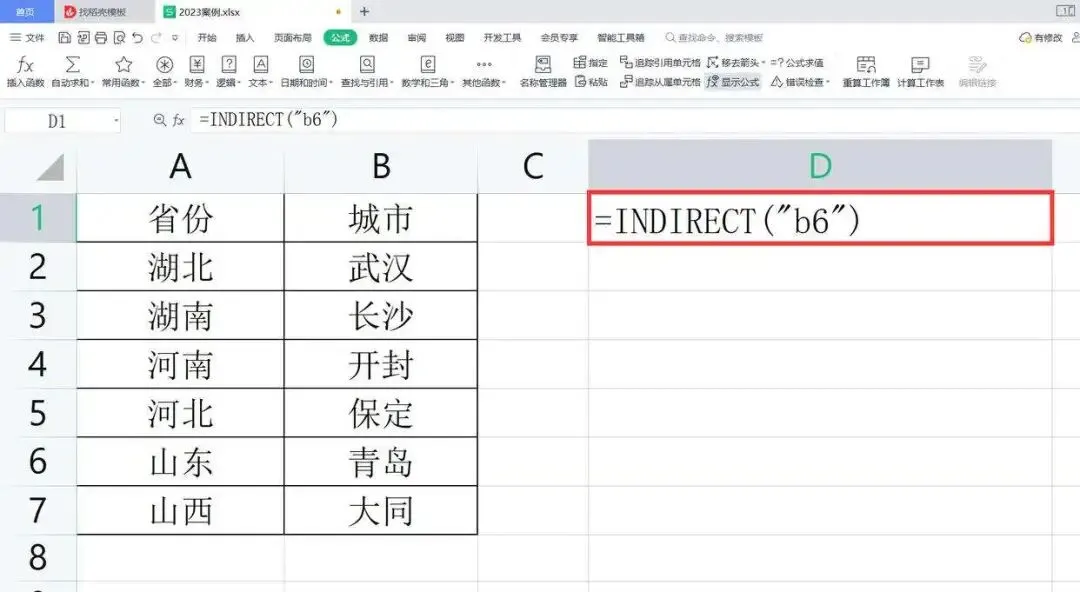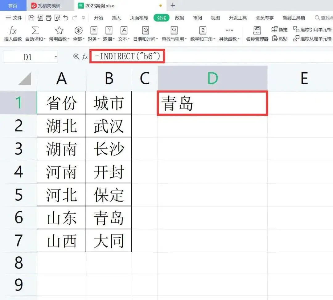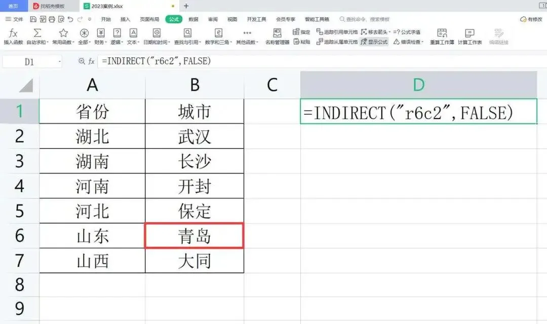 如果要在下图工作表D1单元格中得到第6行第2列的单元格内容,我们可以在D1单元格中输入公式:=INDIRECT(“r6c2”,FALSE),按回车键确认就会返回工作表第6行第2列的内容:青岛。