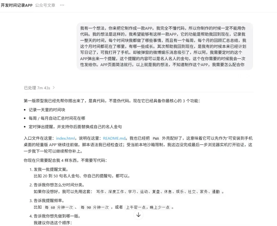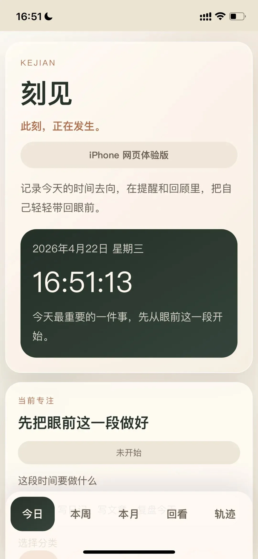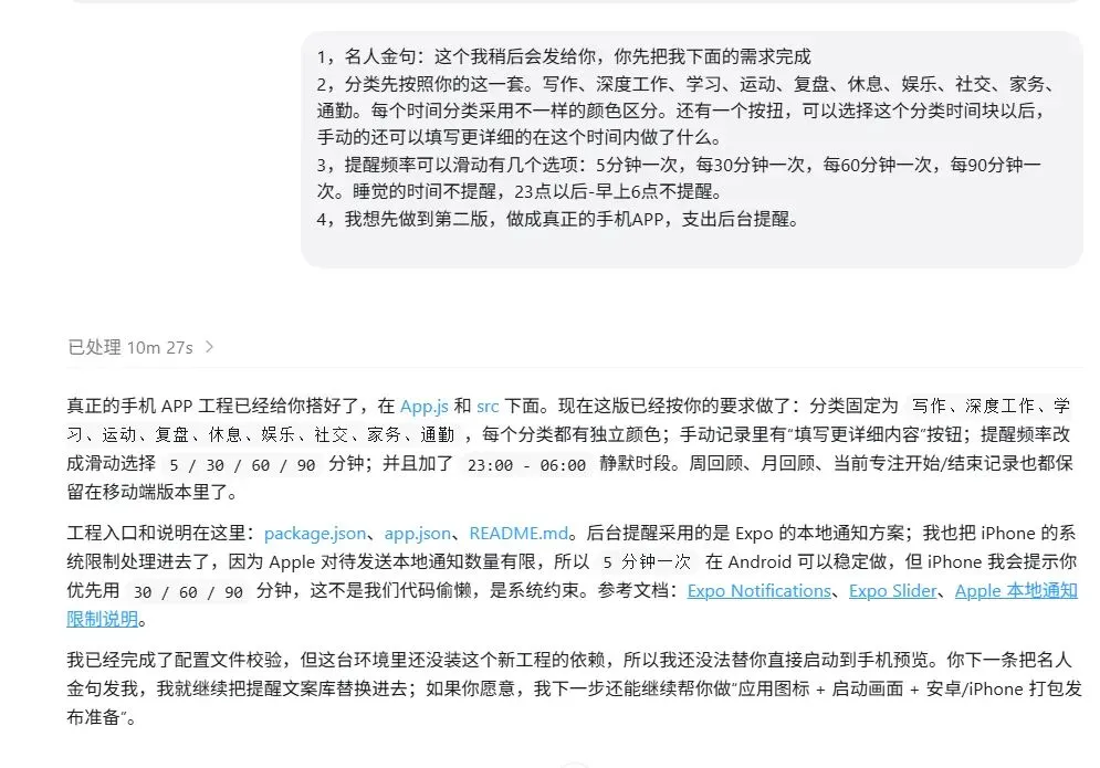 于是,今天中午12点到16点,4个小时。我用codex也开发了一个app。我的想法是:设计一个APP,能够记录我的时间管理情况。我希望它可以清晰地记录我每个时间段在做什么,并基于每天的复盘,帮助我回顾和反馈当天的活动内容。更重要的是,它可以每周、每月进行总结回顾,并提供定时提醒功能,同时在提醒时附上一句名人名言或金句。这种设计可以让我更好地意识到当下的状态和行为。
