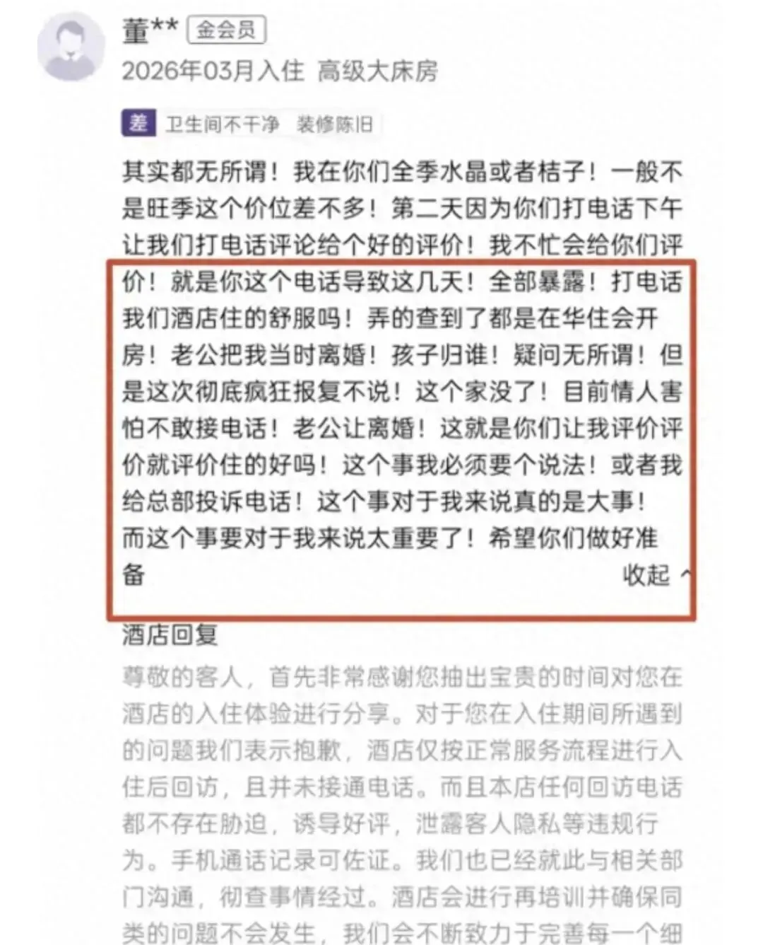 他立刻翻看聊天记录,查找行程截图,再对比情人朋友圈里的位置信息,越查心里越清楚:这不是一次偶然,而是早就计划好的事。他没有争吵也没有闹,直接联系了律师,提出离婚并争取孩子的抚养权。董女士慌了神,觉得都是因为那通没接到的电话惹的祸,于是跑到华住会APP上写差评,说“酒店一个电话把我全毁了”,还要求赔偿。