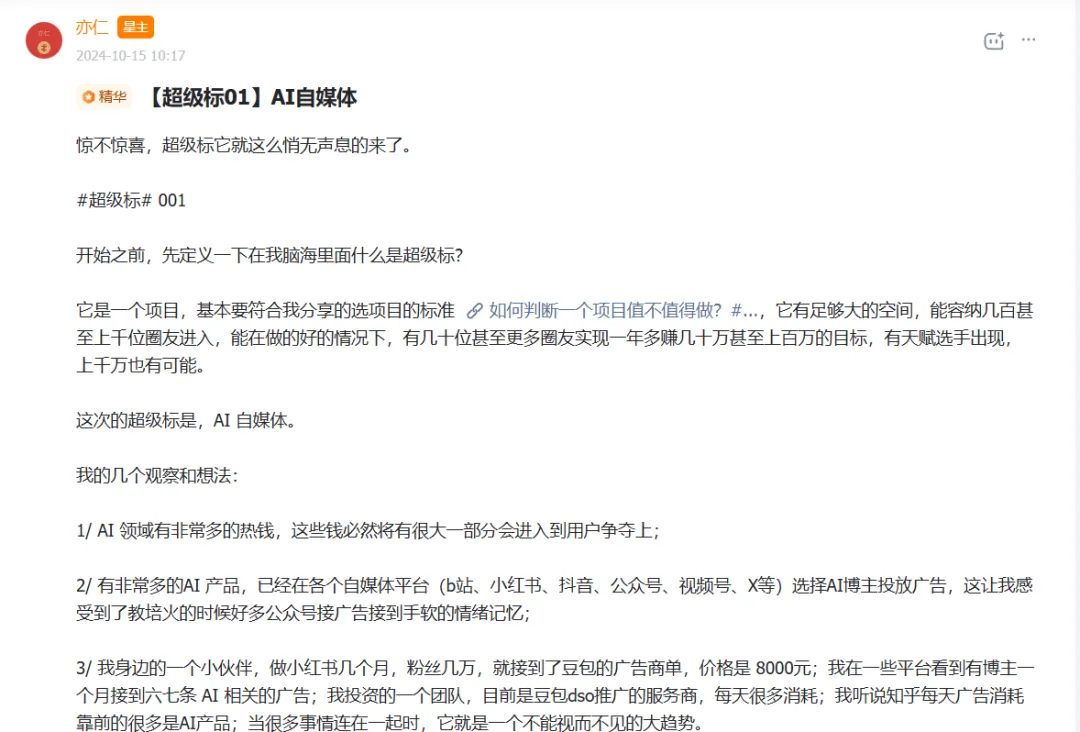 就这么稀里糊涂地开始了,真正让我坚定下来的,是读到亦仁老大的「AI自媒体超级标」那篇文章。