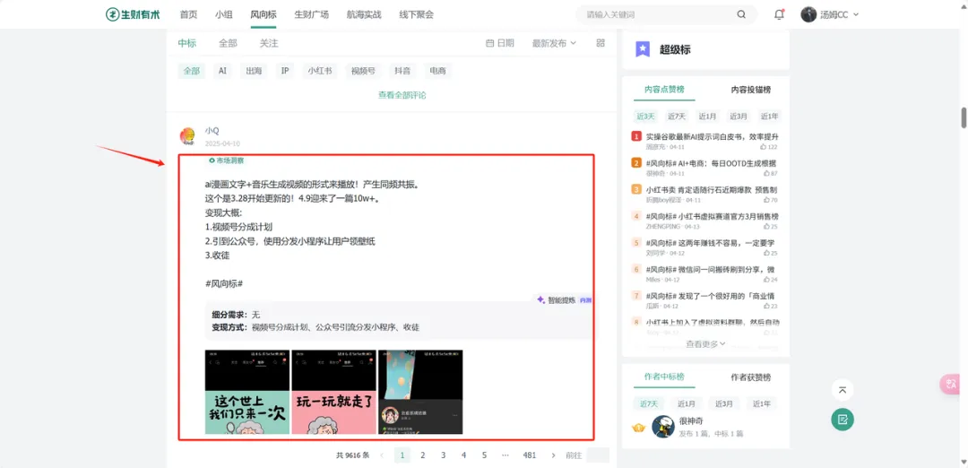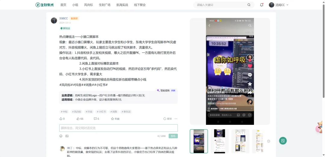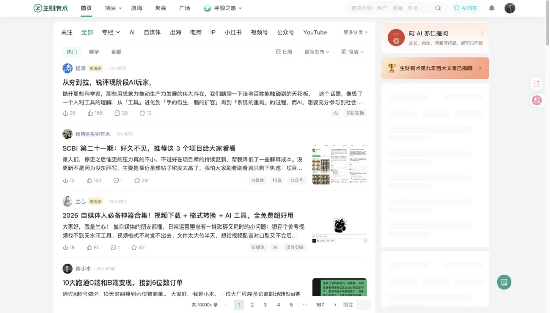 第一,持续看到赚钱的机会。做AI自媒体之后,我接触的信息主要集中在技术和内容层面,但商业层面的嗅觉其实很容易钝化。生财帮我保持了这种敏感度——风向标、精华帖、亦仁老大的文章。生财给我的不只是信息,更是一个不断校准方向的参照系。